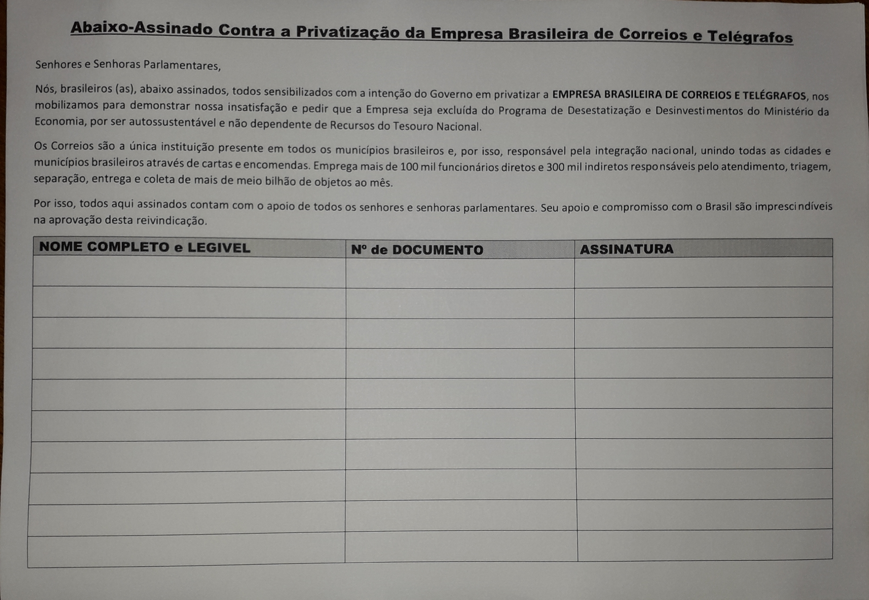A ABRPT disponibiliza o modelo Contra Privatização dos Correios para que o mesmo seja assinado. Horário de funcionamento da associação: segunda, quarta e sexta das 9h às 12h.